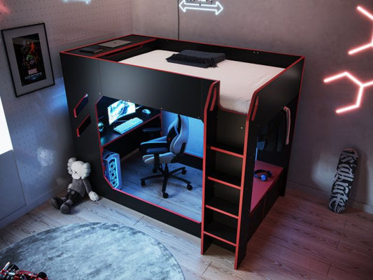 Recoil Shuttle Small Double High Sleeper Gaming Bed with LED Desk Black