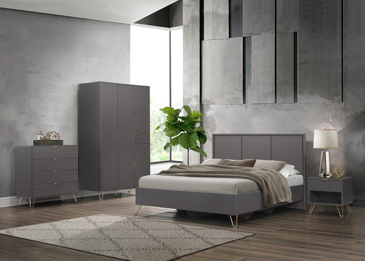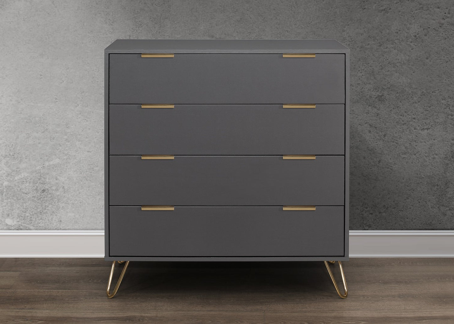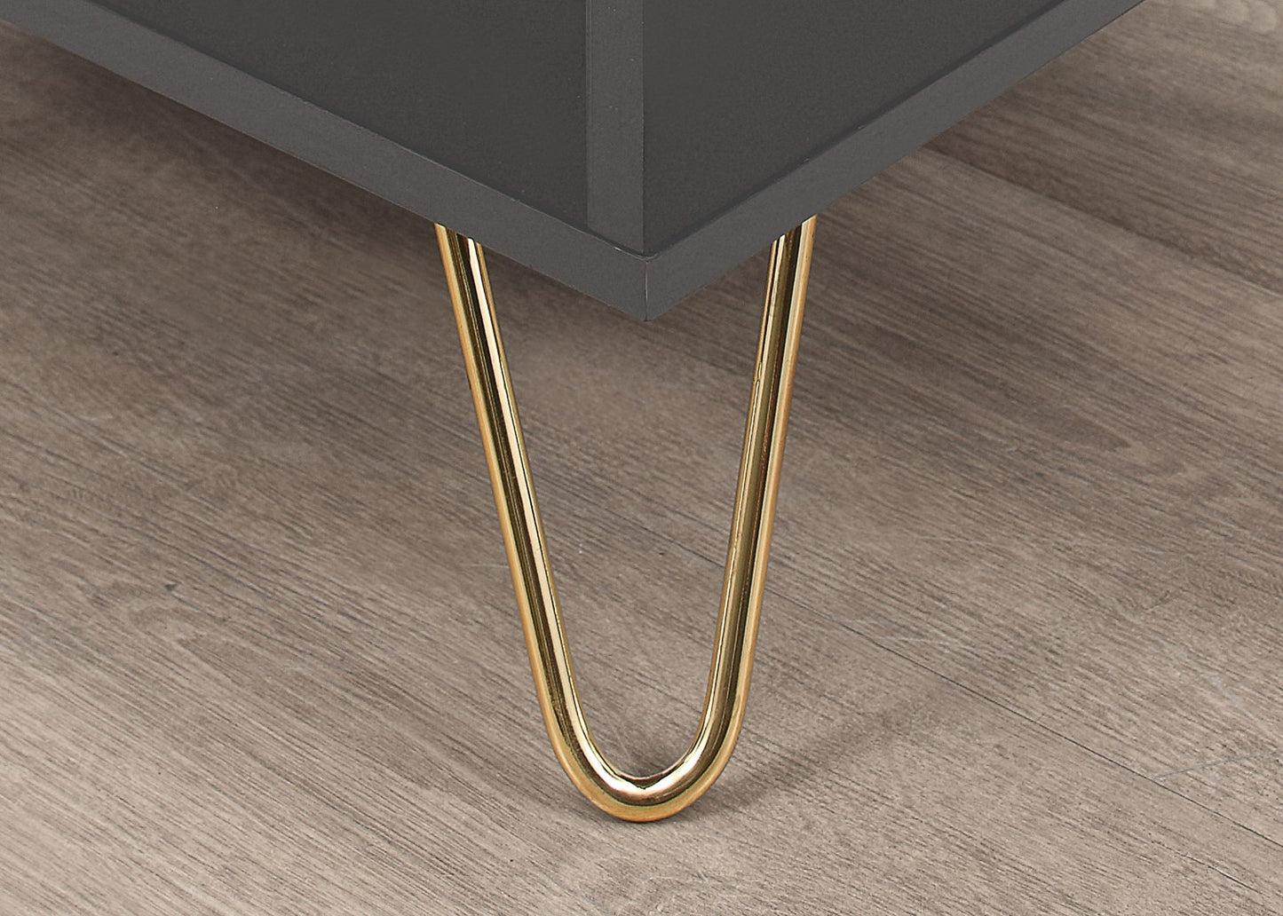 The Arlo's stylish matt grey finish brings a fresh and modern look to any bedroom. With gold accent handle and hair pin legs this range is sure to impress. This versatile range is crafted from particle board with modern grey effect finish. Care instructions: Wipe carefully with a soft, dry cloth.