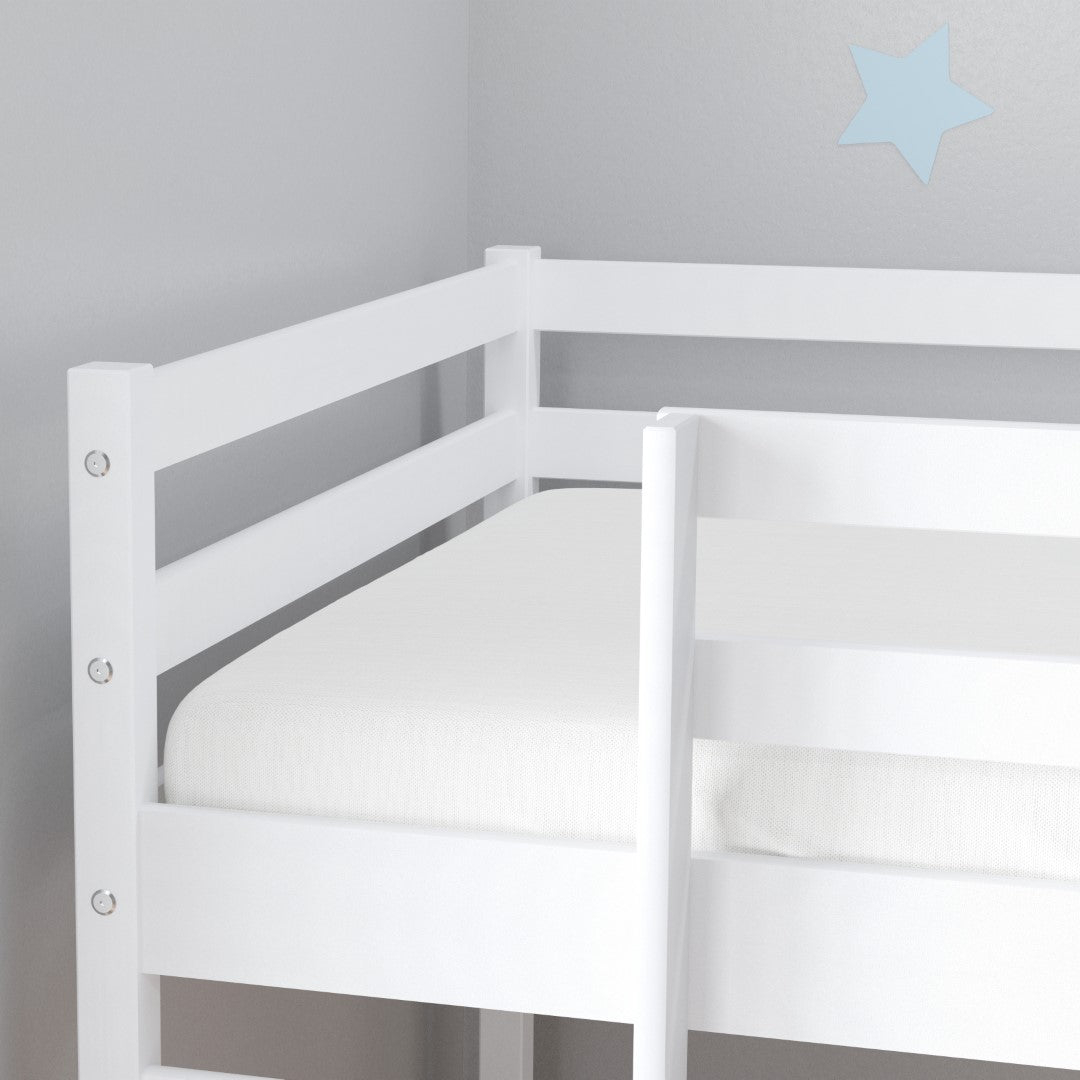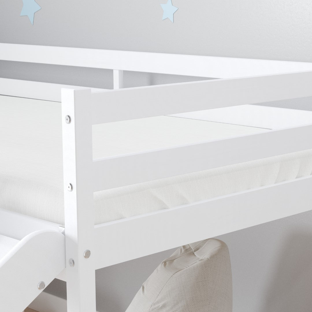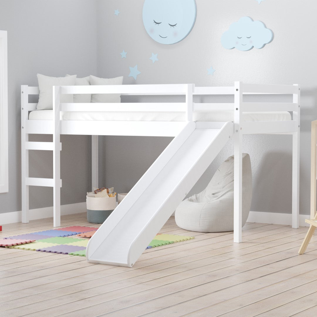 The Birlea Frankie 3ft Single Midi Sleeper Bed with Slide combines fun and functionality in one stylish design. Made from solid white pine, this raised mid sleeper includes a built-in slide for a playful wake-up every day. Ideal for smaller bedrooms, the elevated frame offers useful space underneath for storage or play.