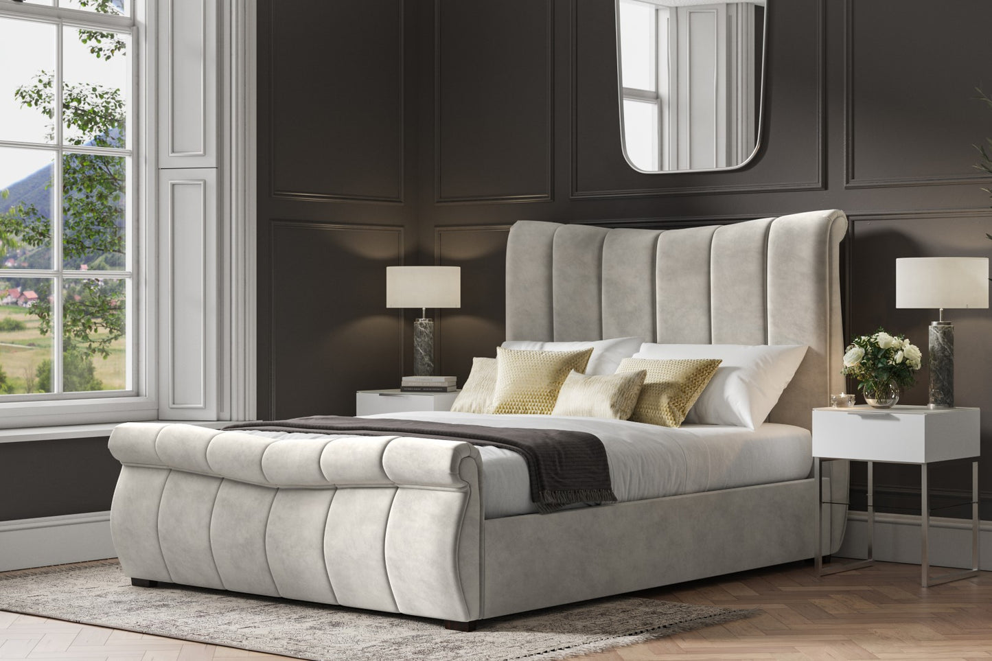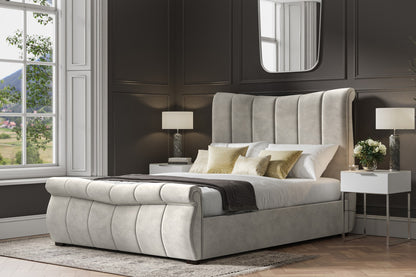 The Bosworth Fabric Ottoman Sleigh Design Storage Bed; the epitome of refined elegance and modern functionality. The Bosworth Fabric Ottoman Sleigh Design Storage Bed features a stunning scroll top foot design with intricate lines on both the headboard and footboard. The elegant curves and plush fabric upholstery exude sophistication; making this bed a timeless addition to any bedroom. The Bosworth Fabric Ottoman Sleigh Design Storage Bed. The convenient gas lift provides ample storage space; keeping your bedroom clutter-free and organized. Available in sizes King and Super King; this bed is perfect for those who appreciate both style and practicality.