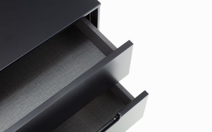 A stylish, retro-inspired bedside cabinet with two drawers in an immaculate matt anthracite lacquered finish, with complementary tapered oak finish legs and recessed handles to provide easy opening. The sleek Scandinavian feel fits beautifully with any décor.