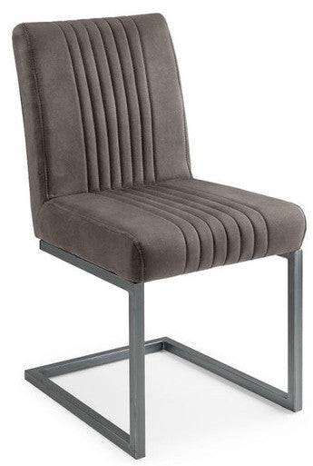 The Brooklyn Dining Chair has an industrial, retro design in a charcoal grey suede finish with a cantilever style gunmetal leg frame. Offering maximum comfort and style, this padded chair beautifully accompanies the Brooklyn Dining Table.