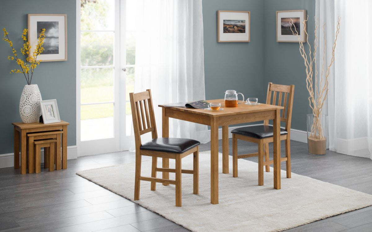 ring timeless charm and practicality to your dining space with the Julian Bowen Coxmoor Solid Oak Square Dining Table. Expertly crafted from 100% solid oak, this high-quality dining table features a warm, rich finish that enhances the natural beauty of the wood grain. Designed to comfortably seat 2 to 4 people, it’s the ideal choice for smaller dining rooms, kitchens, or open-plan living areas.