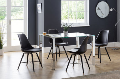 The Enzo is a contemporary and compact chrome and tempered glass dining table that is perfect for modern living. The clean and crisp finish forms a versatile look that fits with a variety of different dining chair styles.