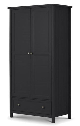 Julian Bowen Maine Anthracite 2 Door Combination Wardrobe, Anthracite, Engineered Wood. An elegant New England style wardrobe with two doors and one drawer. The combination of exquisite anthracite lacquered finish with characteristic side panelling and detailed chamfered cabinetry makes for a soothing and refined aesthetic with timeless appeal, while delicate pewter handles add the perfect finishing touch.