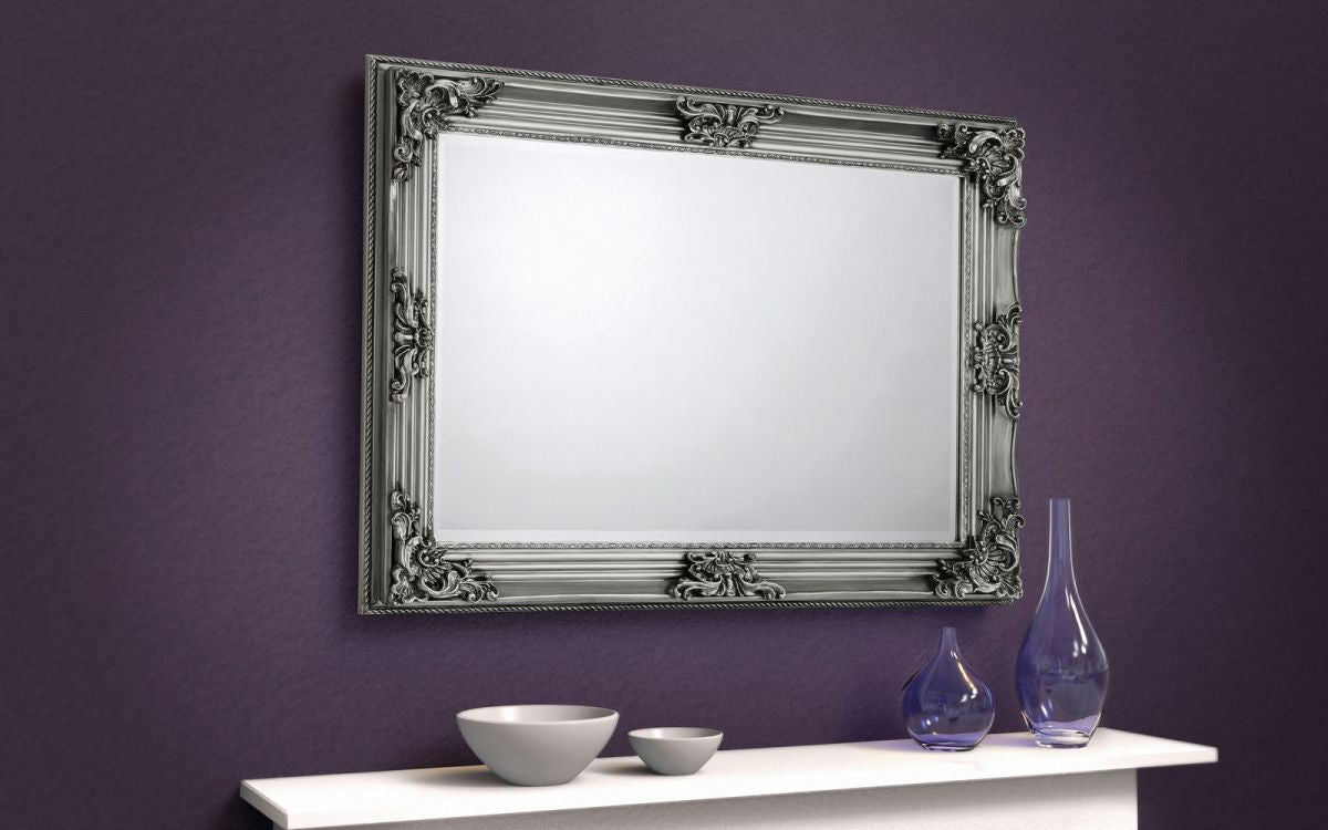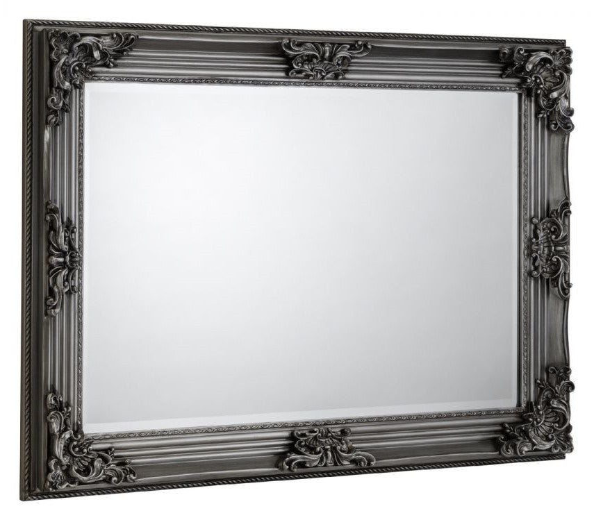 The Rococo wall hanging mirror is a contemporary take on a classic design. Featuring high quality bevelled edges with antique effect detailing in a pewter effect finish, suitable for a wide range of décor. Crafted from a hardwood frame with resin molding, this mirror can be hung either in a landscape or portrait orientation suitable for any room.