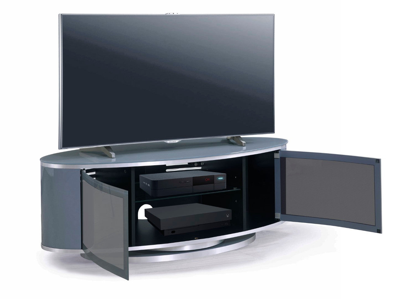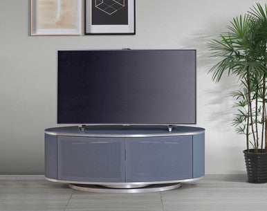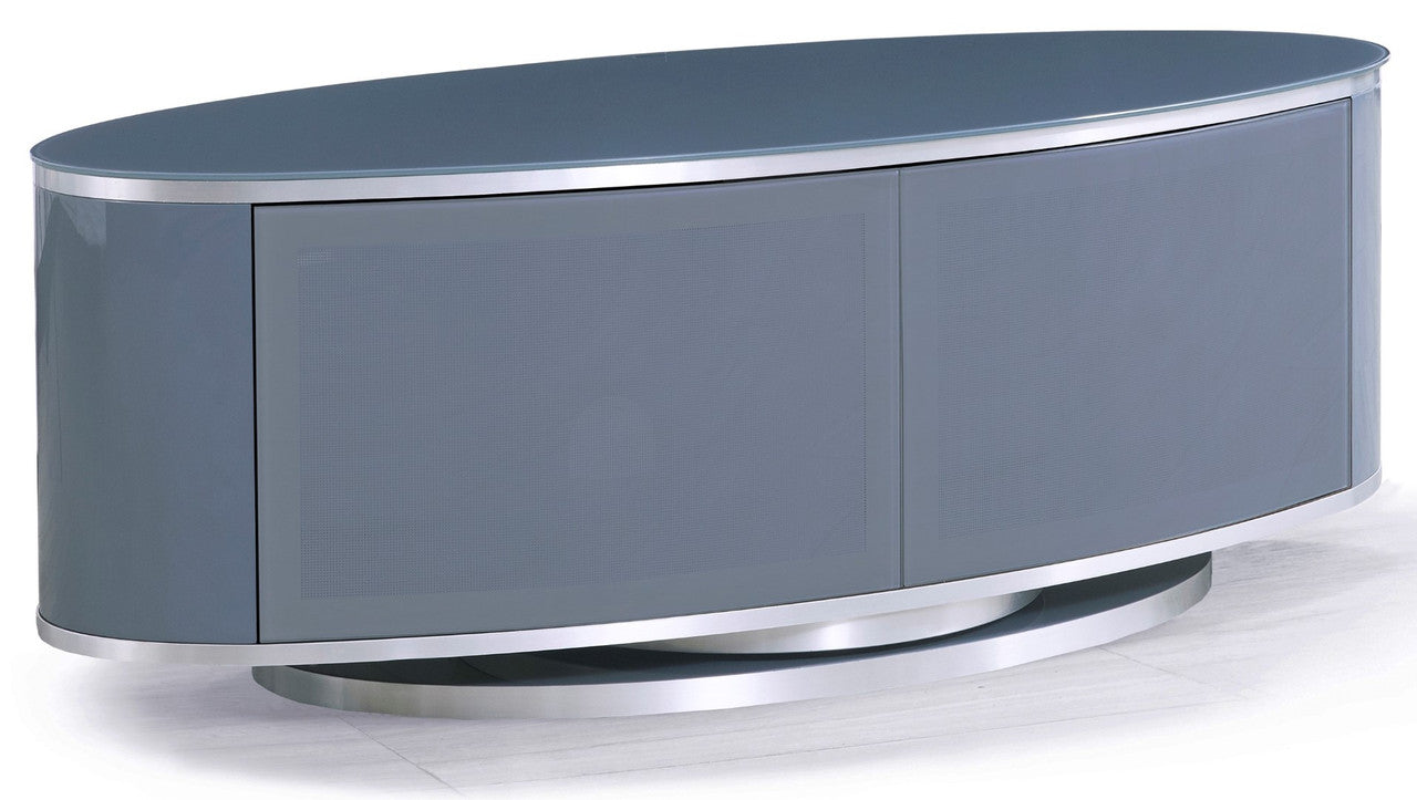 Modern luna grey high gloss oval tv cabinet from MDA designs will be a talking point in any room. Constructed with only the highest quality materials this offers substance as well as good looks. Packed with features such as Beamthru System glass that allows you to operate equipment inside with your remote, 360 degree rotation for optimum screen positioning. Suitable for LCD, LED and Flat screens up to 50 inches.