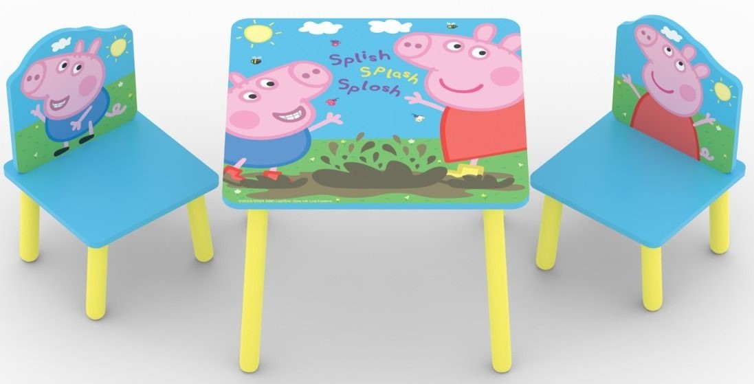 The Peppa Pig Table & 2 Chairs is for kids' that love to play, read or draw. Featuring high quality digitally printed graphics of your favourite characters, Peppa & George splashing in the mud on the table top and on the chair backs.