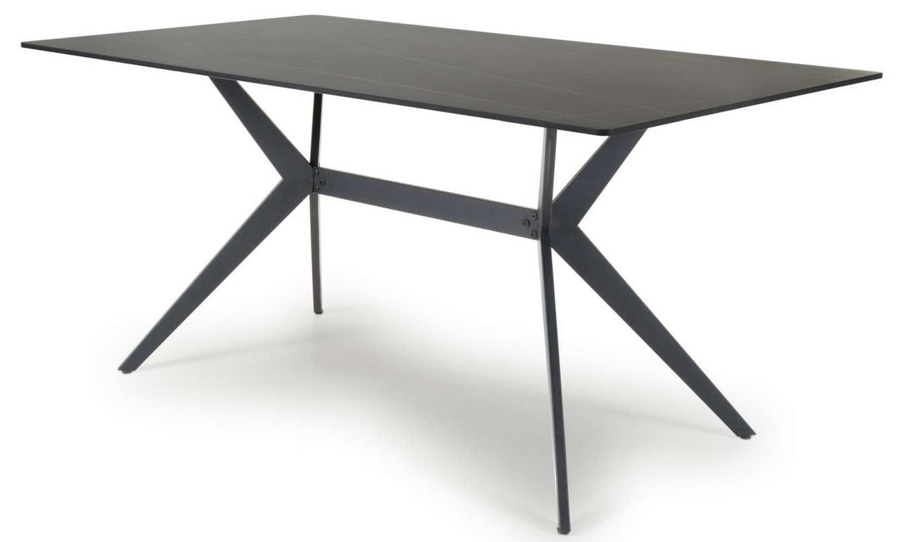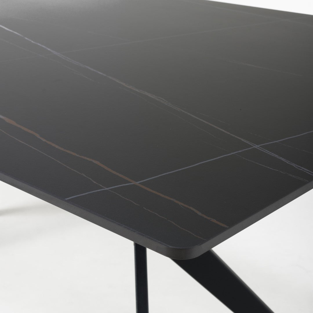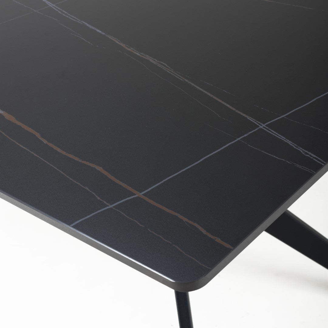 This trendsetting sintered stone dining table is set off by fashionable diagonal orange and white criss cross markings. The sturdy 12mm thick ceramic table top comes in an attractive reflective black finish. Completed by stylish black powder coated metal X-frame legs. Assembly required. Sold individually.
